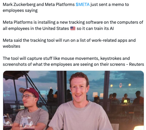 I know someone who in his first week at Meta was told ‘presume someone is watching everything you do, and listening to everything you say’. Now they are: