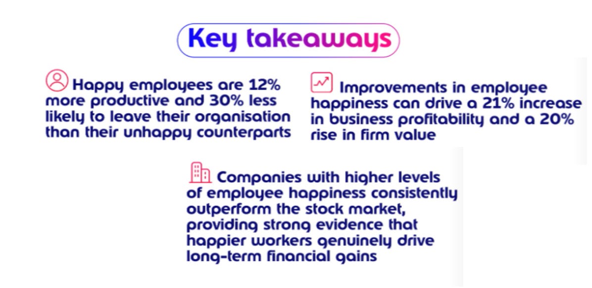 Opening with the context that half of all employees are unhappy at work right now, the report sets out the case for culture. Big stand out data points for me were: