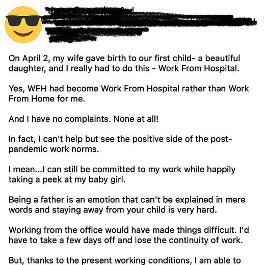 A new study on WFH released this month suggests that total hours worked goes up 30% but total output doesn’t change - meaning productivity falls by about 20% - the secret for for every firm is cracking this overworking issue
