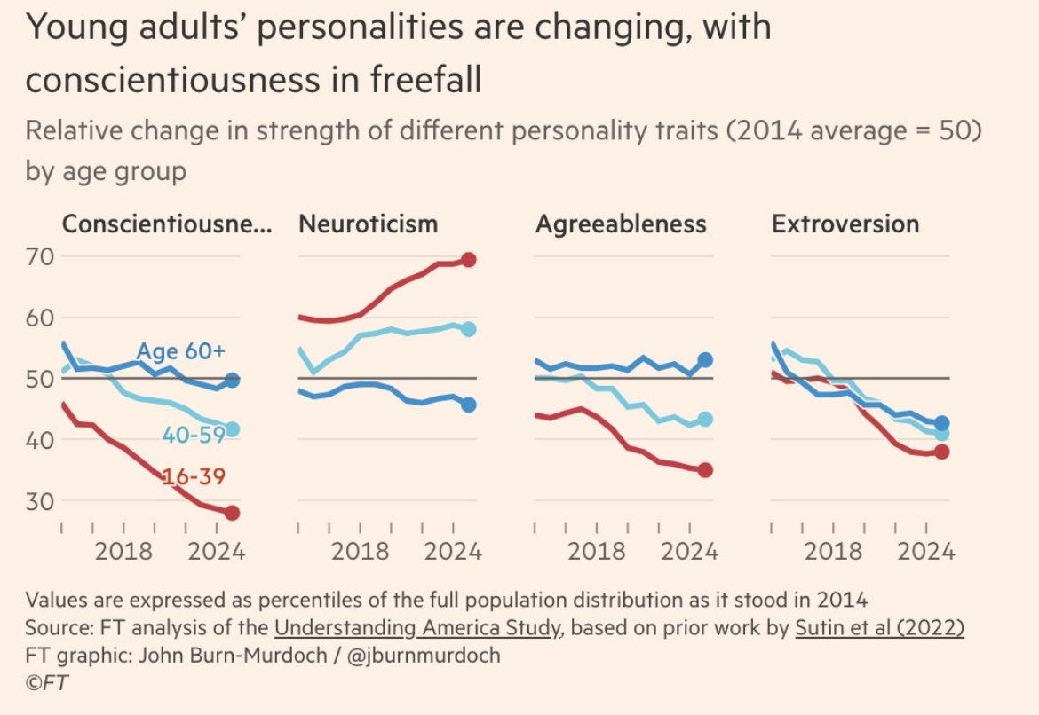 Demographic commentary can very easily tumble into generational blaming but new data from the FT's John Burn-Murdoch this week highlighting a ‘troubling decline in conscientiousness’ goes way beyond clickbait headline grabbing. (Alternative archive link).